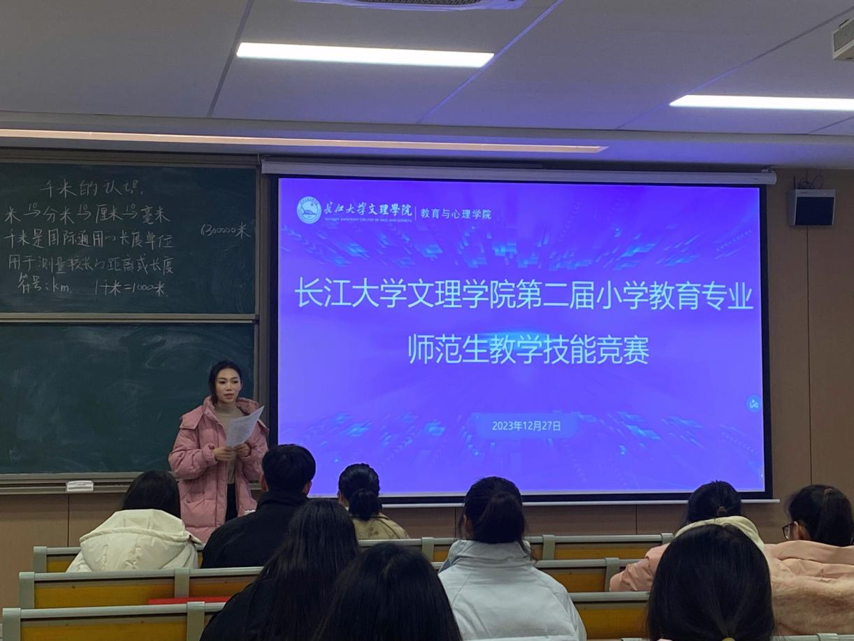 本网讯(通讯员 郑佳琳)为提升师范生教学实践能力,培养师范生教师专业素养,12月27日下午两点,教育与心理公司在C-217教室举办了第二届小学教育专业师范生教学技能竞赛决赛。荆州市九店小学教师王露,教育与心理公司小学教育专业教研室主任陈健苇、教师张一诺担任评委,来自2022级小学教育专业的16名同学参加比赛。