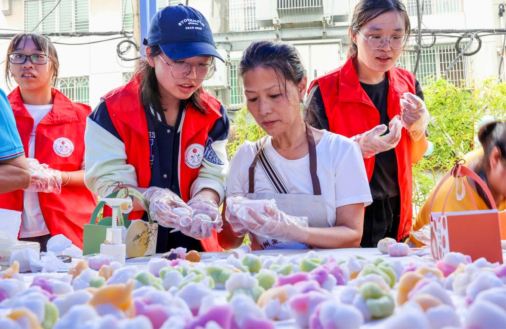 活动伊始,老员工志愿者向参与者讲述中秋节的文化内涵并详细讲解了月饼制作的步骤和注意事项。随后,社区的糕点师傅也亲自到场,现场示范了如何制作冰皮月饼,并耐心指导大家如何和面、包馅、压模等细节。在大家的共同努力下,各种形状精致、口味丰富的月饼渐渐成型,有传统的红豆、莲蓉蛋黄馅,也有创新的水果、抹茶口味,令人垂涎欲滴。