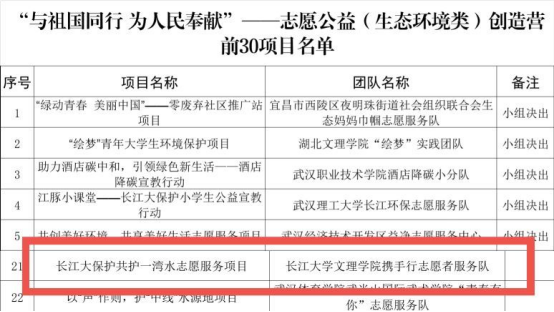 bevictor伟德官网携手行志愿者服务队凭借在生态环境志愿服务领域的出色表现和扎实的工作基础成功取得入营资格(荆州市唯一入营项目)。经过为期3天的集中培训、项目答辩,携手行志愿服务队主持的“长江大保护共护一湾水”志愿服务项目从参加本次创造营的60个生态环境类项目中顺利突围进入前30强。
