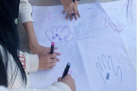 互动墙前,同学们纷纷画出手印、写下祝福,原本素净的墙面渐渐布满五颜六色的掌印与真挚的寄语。陌生与熟悉的手印在此交叠,温暖随掌心的“相印”悄然传递,隔阂在真诚的互动中消融。