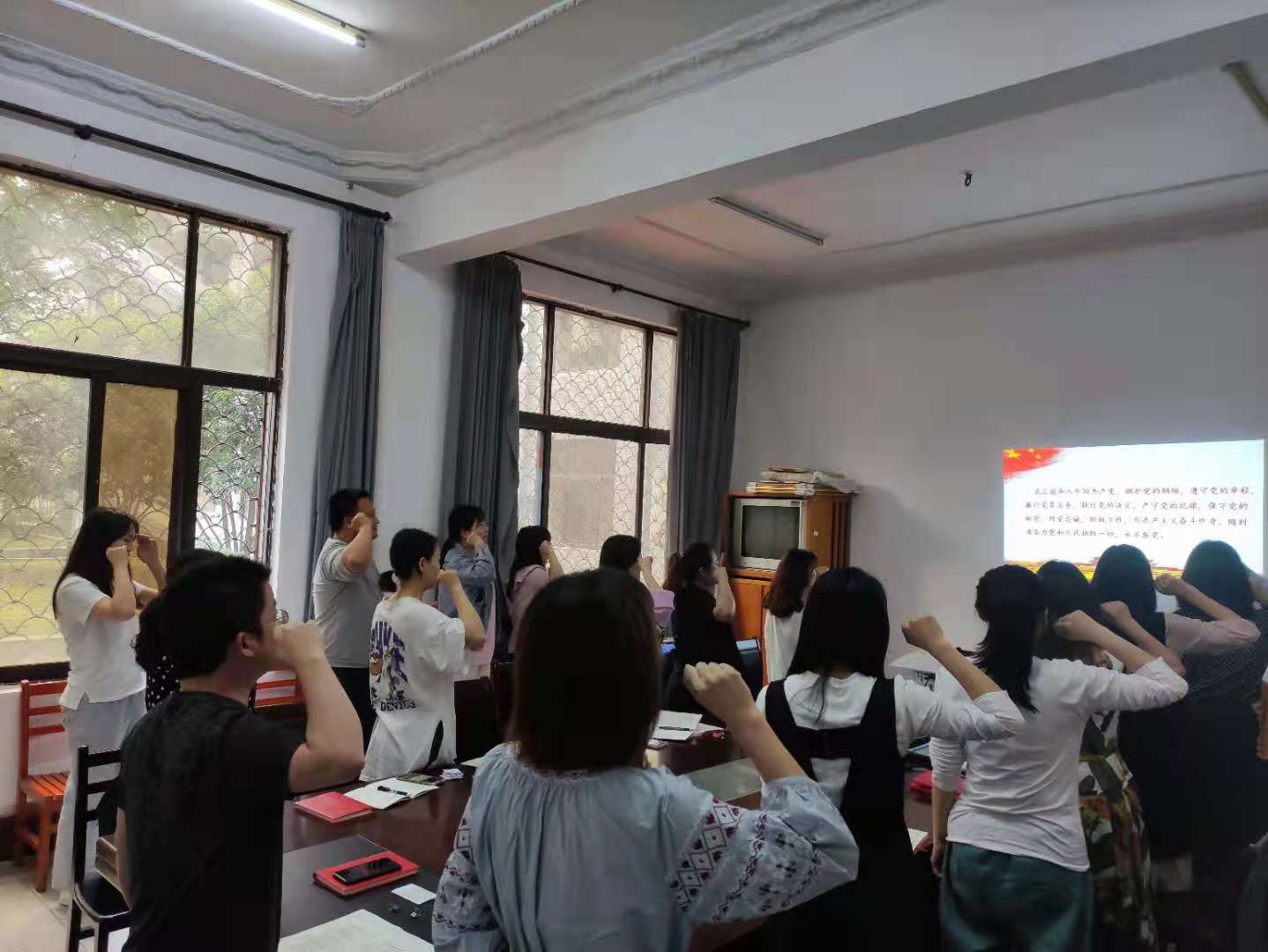 首先,在教工支部书记朱文霞的带领下,全体党员教师重温入党誓词,一起学习了习近平在清华大学考察时的重要讲话精神、《中国共产党普通高等公司基层组织工作条例》,以及《中国共产党章程》第八章内容。