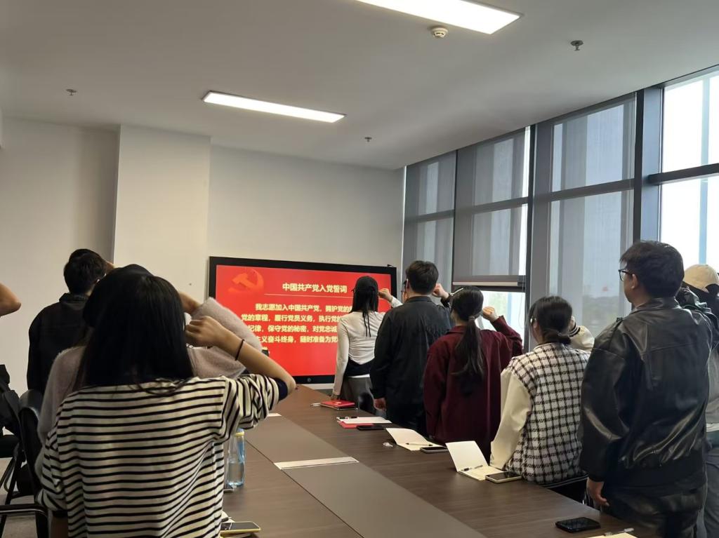 会议开始,成观雄副书记带领全体党员重温入党誓词并简要介绍了党支部人员变动情况。随后,全体党员一起学习了《中国共产党章程》第九章至十一章,党组、党和共产主义青年团的关系、党徽党旗。通过集体诵读,理论学习入脑入心。
