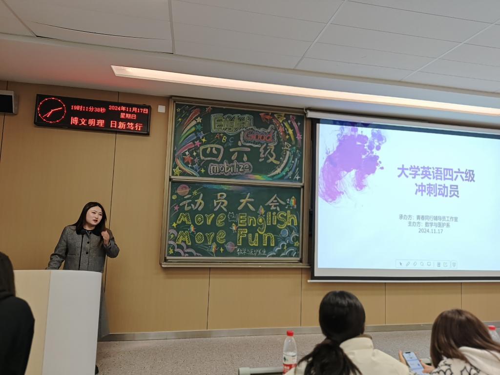 本网讯(见习记者李东霖),2024年11月17日19:00点,数医系四六级动员大会于A410教室成功举行,参会人员有数学与医护系党支部副书记燕梦蝶老师,数学5222班付利婷、王沛雯及全体大二同学。