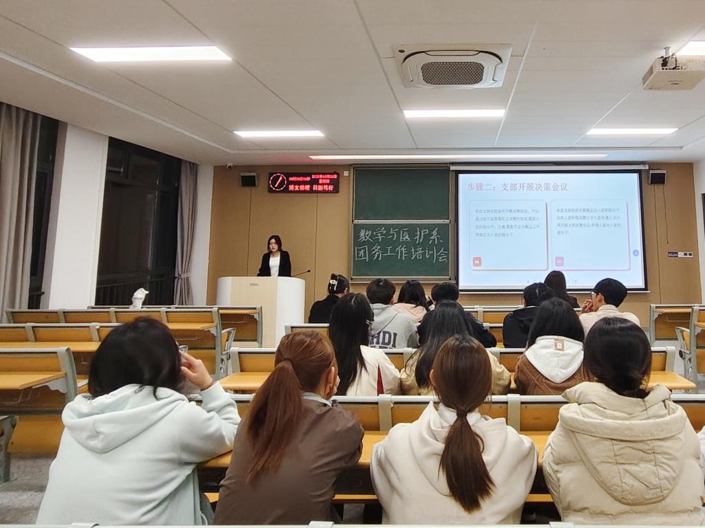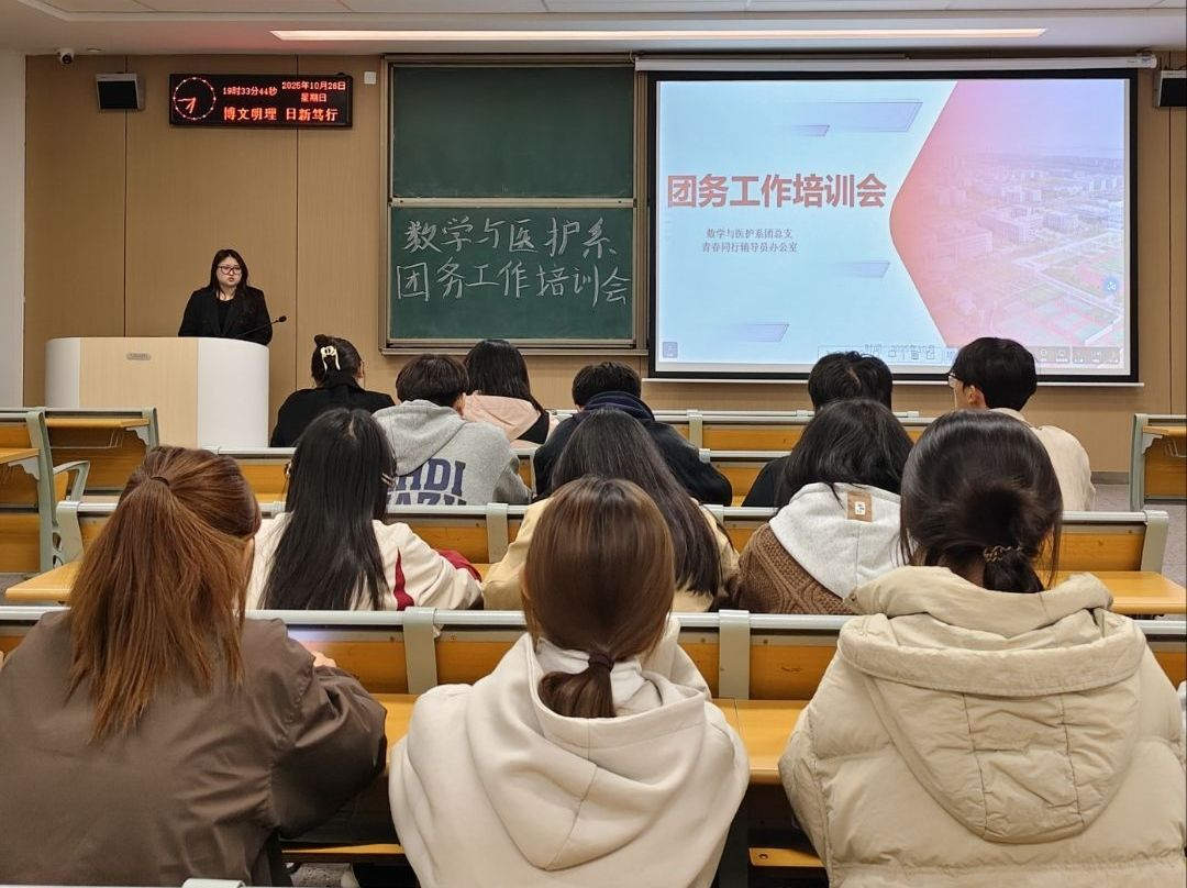 本网讯(见习记者刘金娜)为深入贯彻落实习近平总书记关于青年工作的重要思想,进一步筑牢团的基层组织根基,着力增强团支部工作的规范化水平和高效执行能力,数学与医护系于10月26日19:00在教学楼A-410教室开展团委工作培训会,本次会议由数医系员工会团总支副书记陈怡帆主持,参会人员有数医系党总支副书记燕梦蝶、优秀团支书代表阮佳莹、沈诗琴、甄若彤,2025级各班团支书及员工会组织部全体成员。