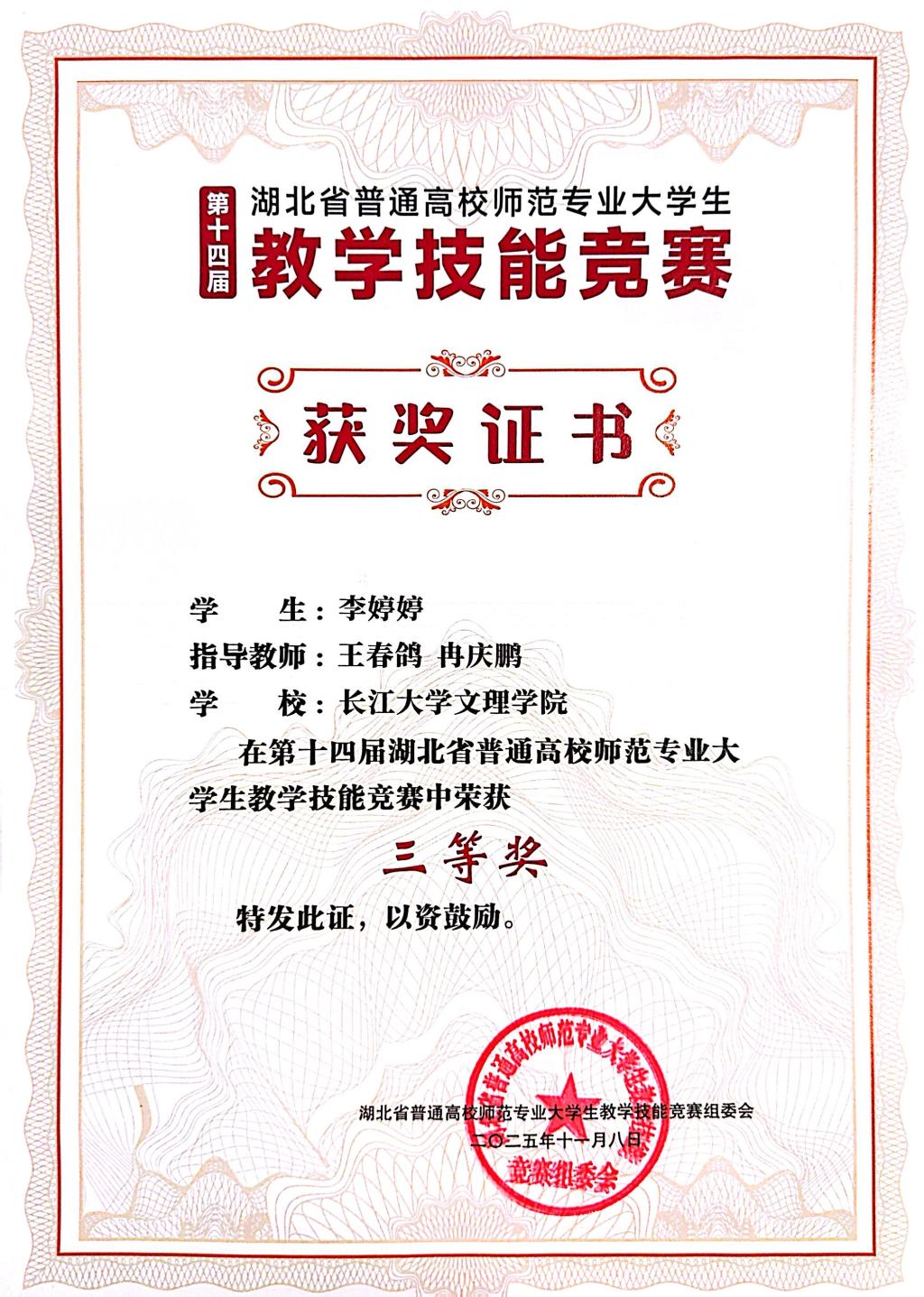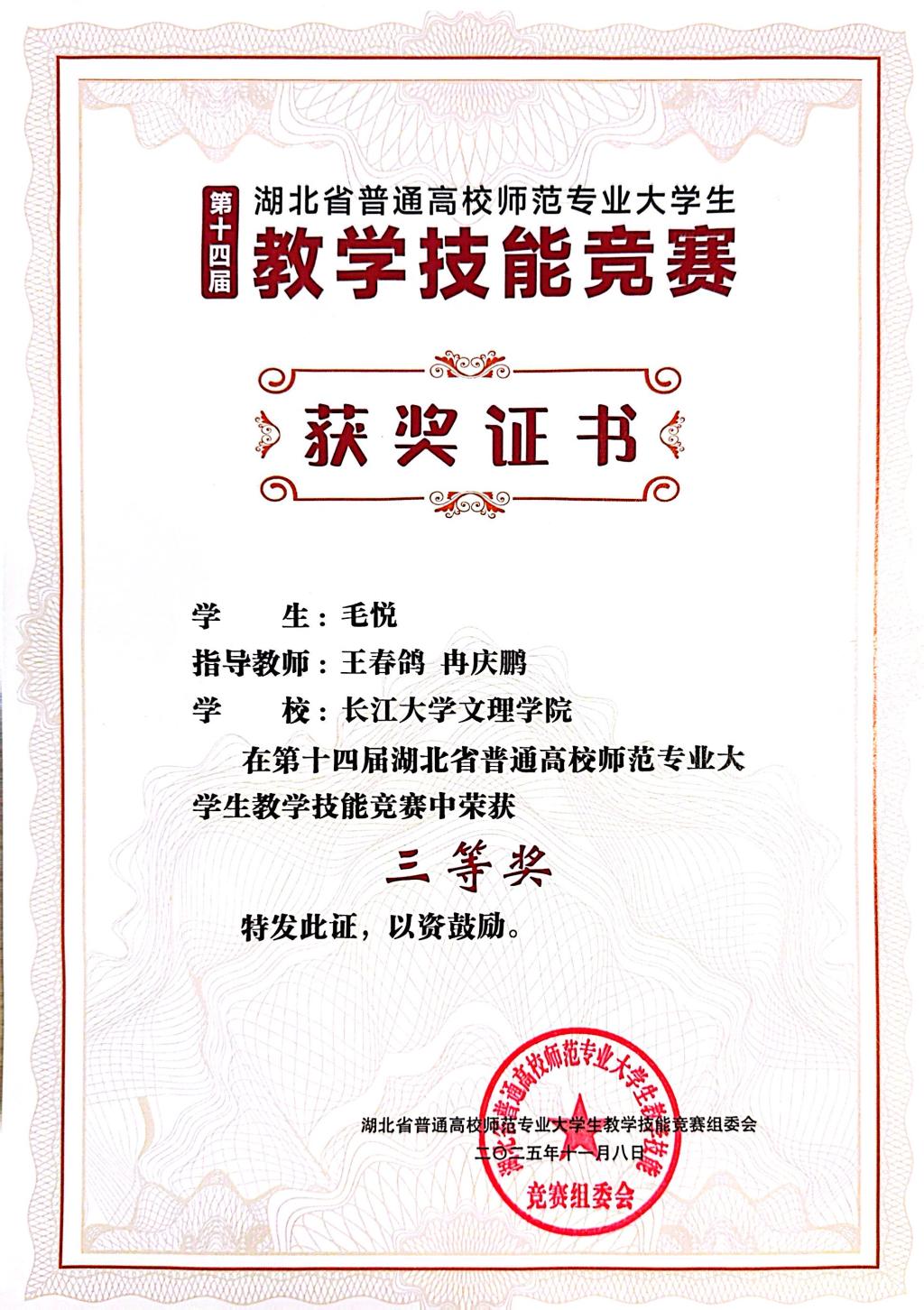 2025年11月8日,第十四届湖北省普通高校师范专业老员工教学技能竞赛决赛在华中师范大学圆满落幕,本次竞赛共有全省16所高校227名员工参加比赛。我系学子凭借扎实的专业素养与出色的教学表现,斩获多项荣誉。李婷婷获得初中数学组三等奖、毛悦获得高中数学组三等奖。