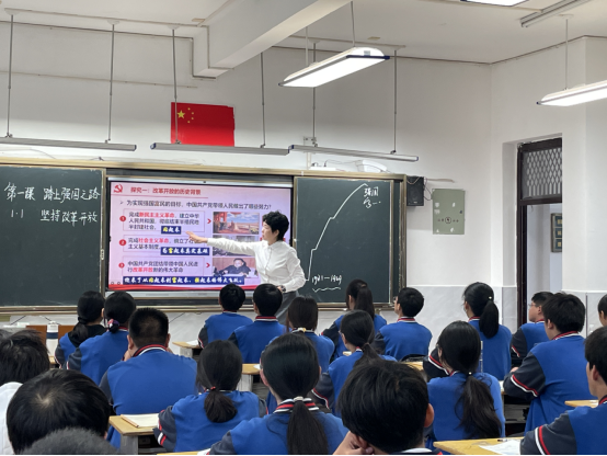 此次交流研讨分为两个环节。第一个环节是观摩荆南中学思政课教师公开课。在课堂上,授课老师就坚持改革开放创设了一系列的问题,以探究式的方式,激发员工主动思考和主动学习,让员工在解决问题的过程学会学习,主动担当,不自觉中提升了员工的六大素养,呈现了现代教育理念指导下的高质量的示范课。