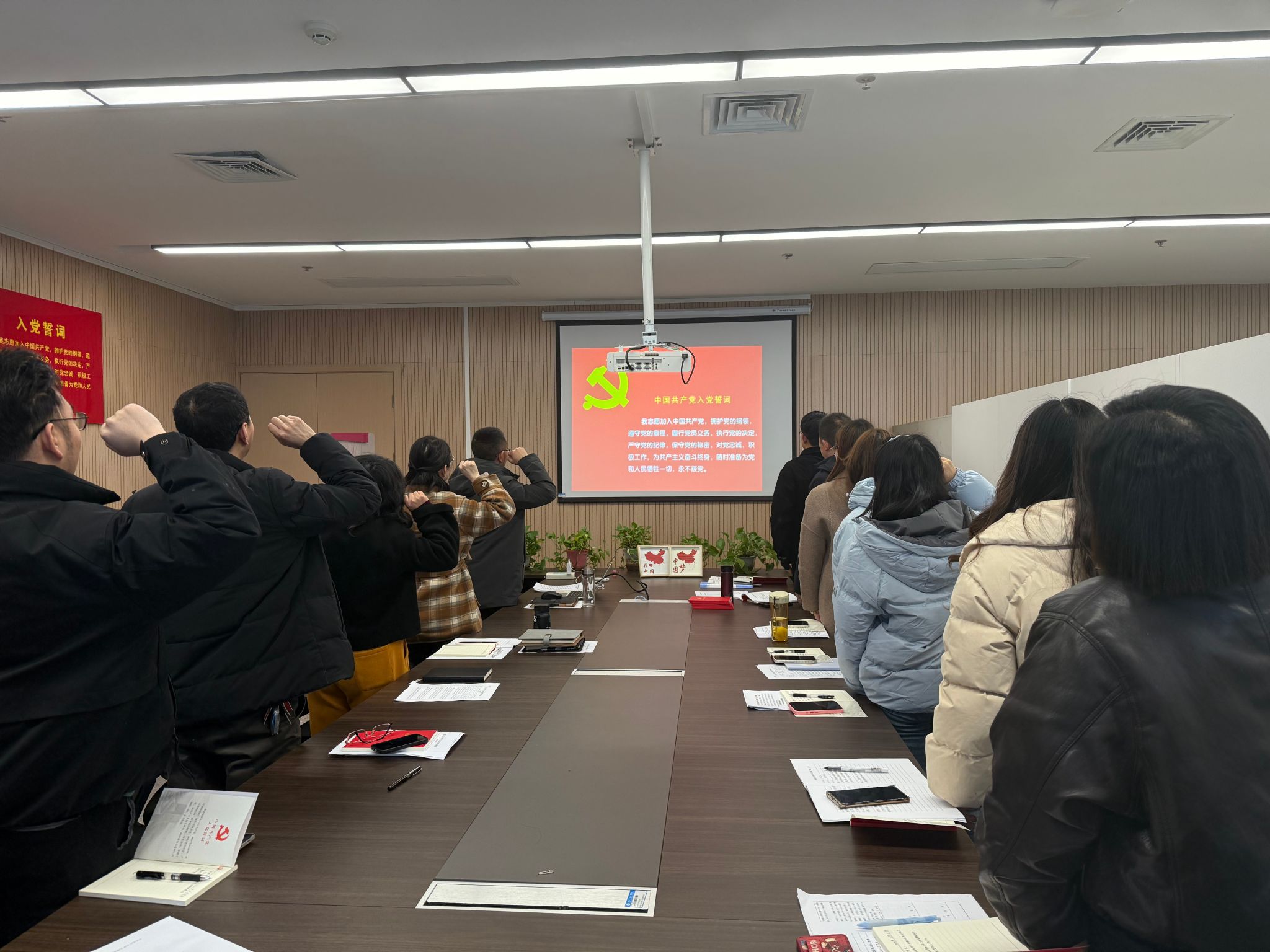 锤炼党性,重温初心使命。理论学习结束后,支部主题党日活动庄严有序展开。在领誓人王长翔同志的带领下,全体党员面向鲜红的党旗,高举右拳,庄严重温入党誓词。铮铮誓言,字字千钧,进一步凝聚了全体党员不忘初心、牢记使命的坚定信念。随后,全体党员严格按照规定程序集中缴纳党费,自觉履行党员义务。大家还集体诵读《中国共产党章程》第四章部分内容,通过原原本本学,进一步强化党章意识,增强党性修养。