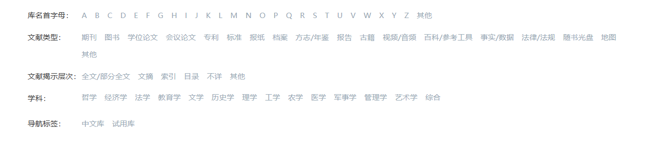 同时提供数据库分面过滤,支持按首字母A-Z、文献类型、学科分类检索,快速筛选出所需数据库,满足读者不同的搜索习惯。