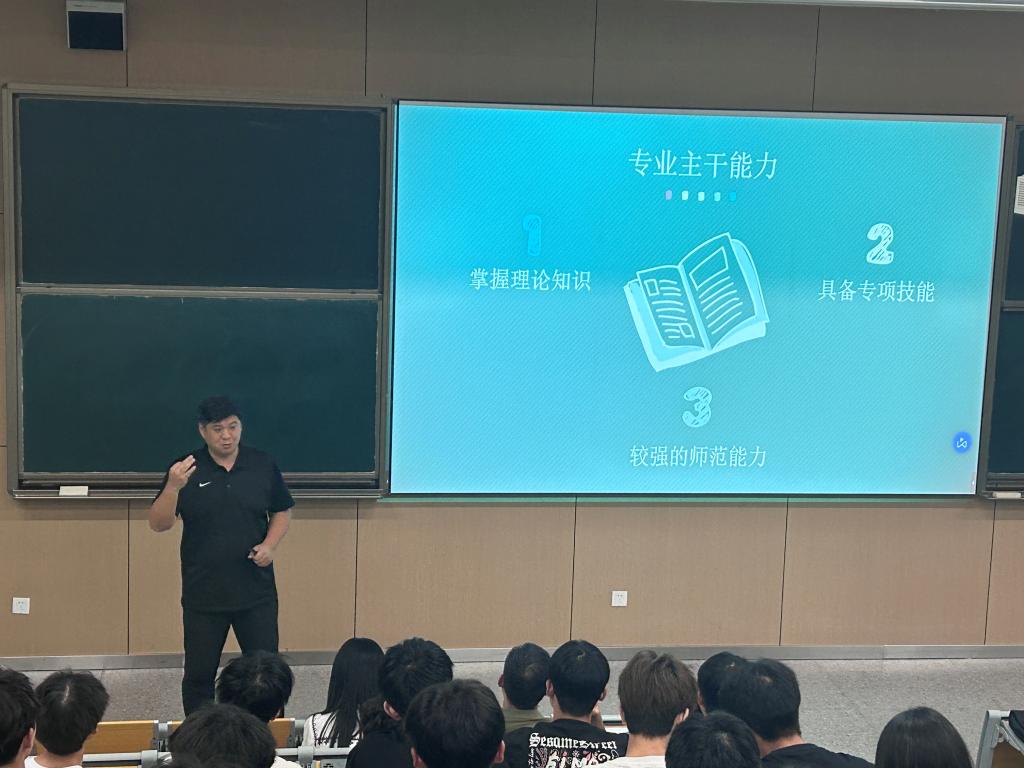 系主任介博从专业简介、培养目标、提成体系、学制学分四个方面对体育教育专业进行了全面解读,并提出“四有体育人”的培养愿景:有高尚的品德、有扎实的技能、有明确的目标、有坚韧的毅力,勉励同学们夯实专业基础,勇担时代使命。