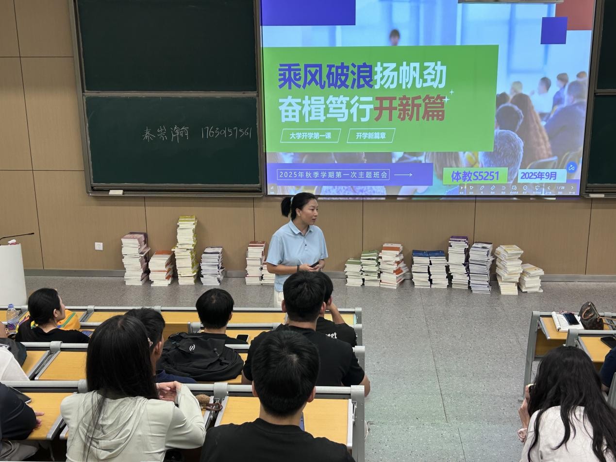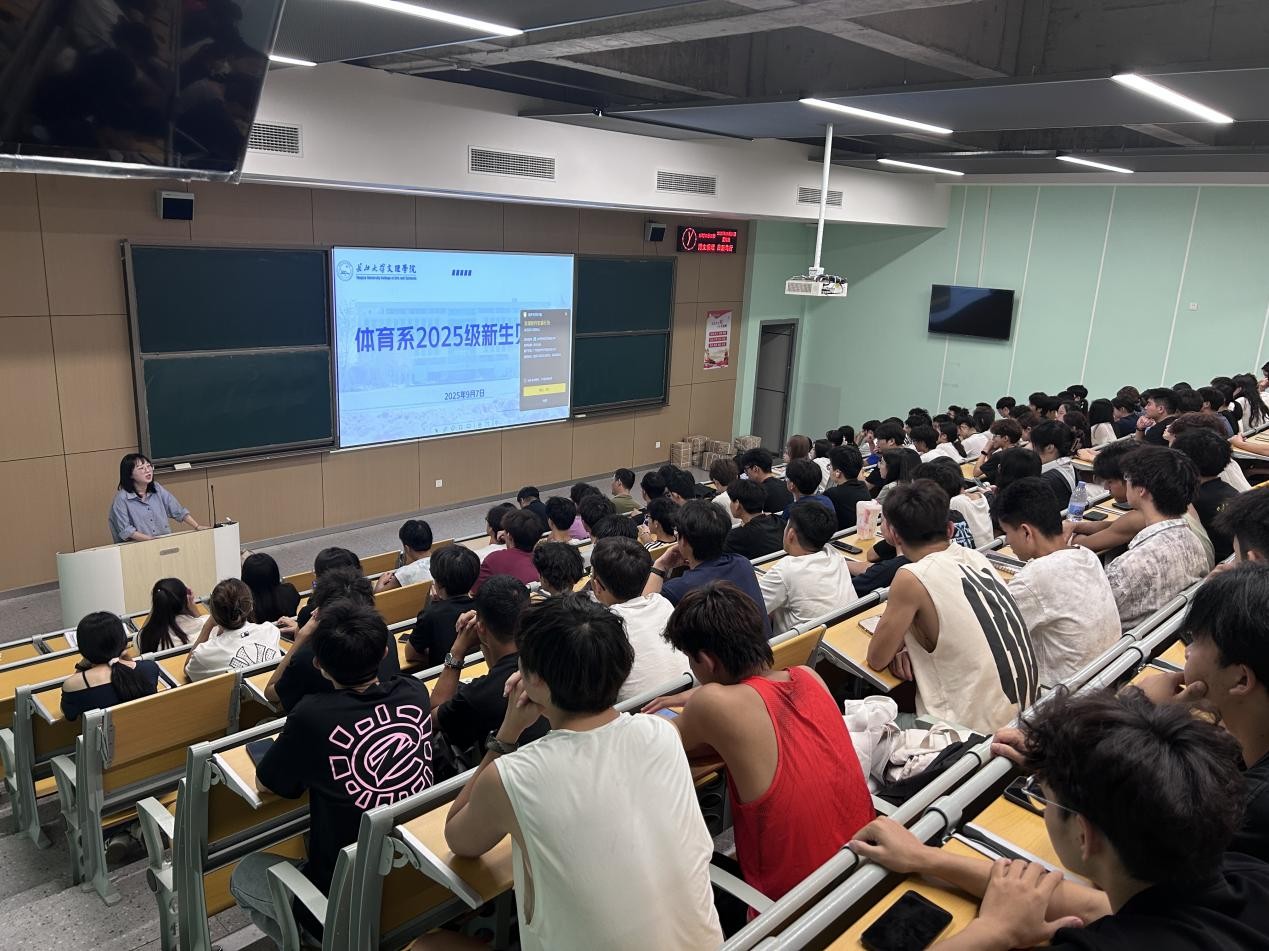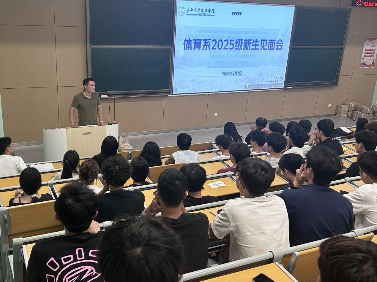 本网讯(通讯员 杨陈明琬)9月7日晚7点,体育系2025年新生见面会暨专业介绍会在教学楼B213教室举行。体育系主任介博、党总支书记邹姜、系部副主任胡杜娟、系部党总支副书记赵婉君、辅导员杨陈明琬、班主任黄贝、向艳梅、邱凤霞与全体新生共赴大学“第一课”。会议由体育系党总支副书记赵婉君主持。