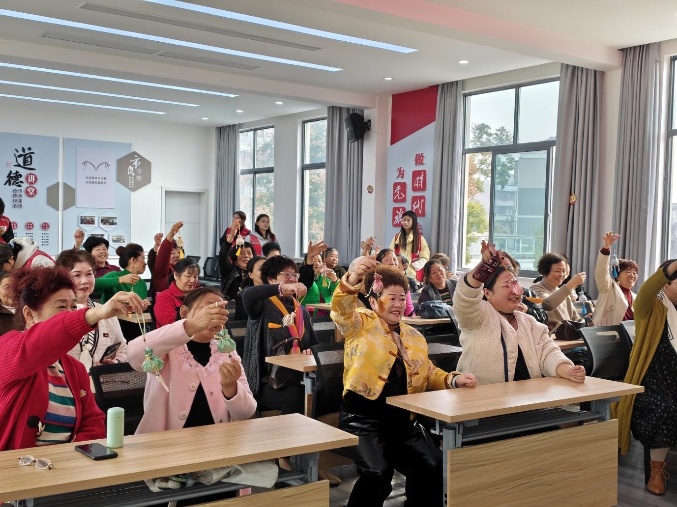 趣味互动环节更是热闹非凡。投壶、做香囊等游戏吸引了众多老人参与,志愿者们主动为老人们递道具,耐心协助高龄老人完成游戏。现场欢声笑语不断,老人们精神饱满、兴致高昂,脸上洋溢着幸福的笑容。活动中,志愿者们还为老人们表演了精心准备的文艺节目,歌曲演唱、乐器演奏等节目赢得了老人们的阵阵掌声,温馨的氛围感染着在场的每一个人。