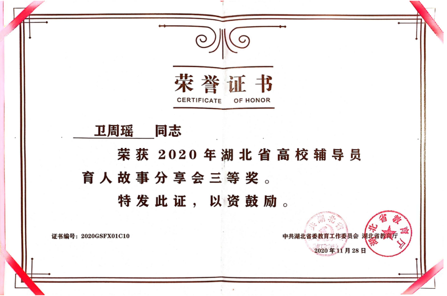 卫周瑶,bevictor伟德官网bevictor伟德官网2007级英韩双语专业5072班,2011届毕业生。现任武汉纺织大学会计公司学工办主任,团委书记。曾荣获2020年湖北省高校辅导员育人故事分享会三等奖等各项荣誉。