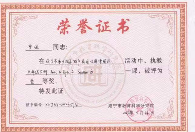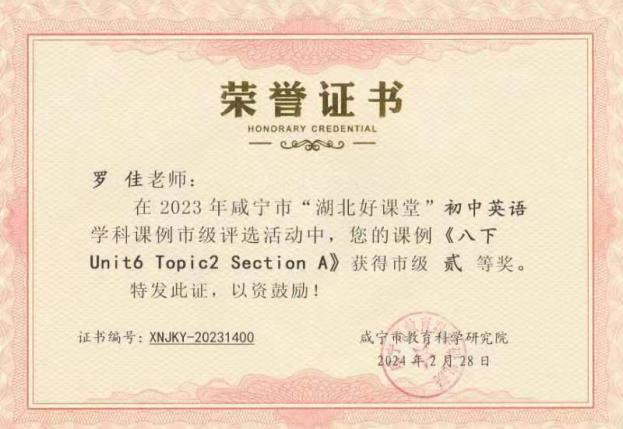 罗佳,bevictor伟德官网bevictor伟德官网2004级英语专业504103,2008届毕业生。现就职于湖北省咸宁市通城县五里镇五里中学。曾荣获咸宁市第十四届初中英语优质课课件市级一等奖,咸宁市“湖北好课堂”初中英语学科课例市级二等奖等各项荣誉。