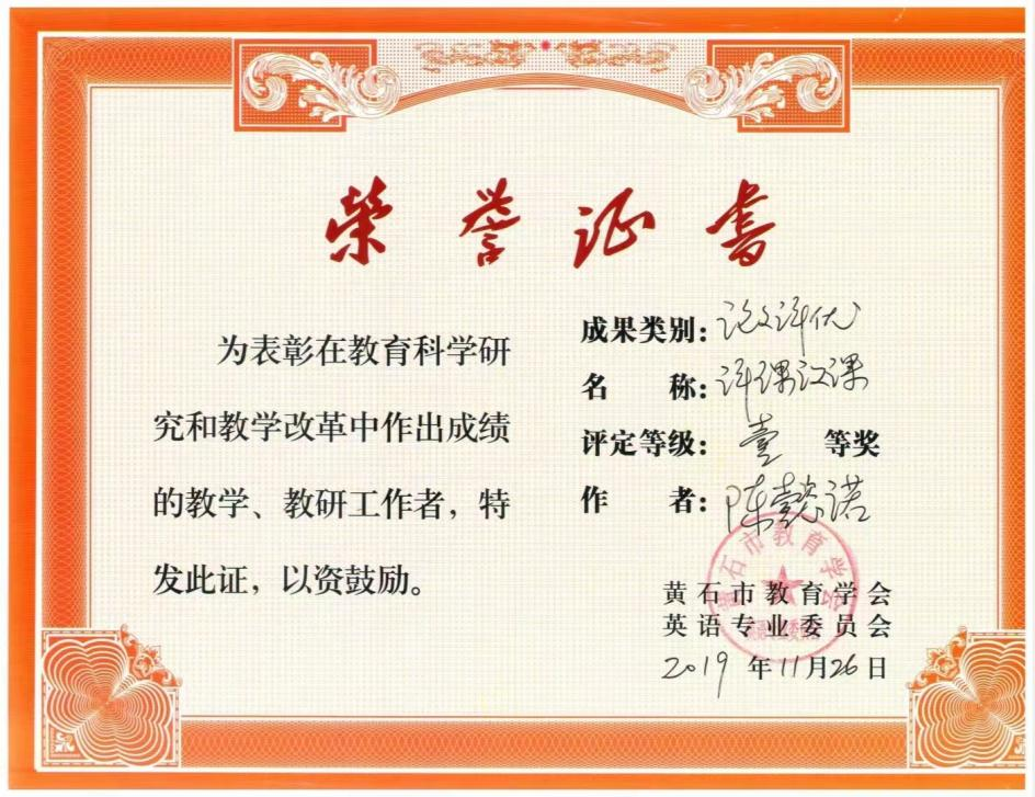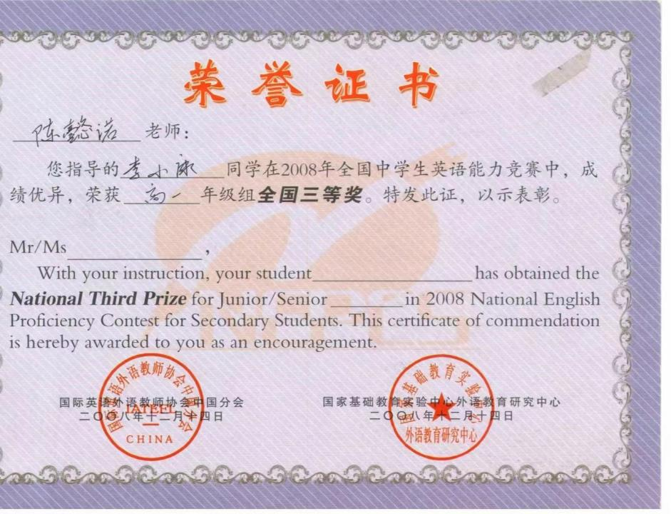 陈懿诺,bevictor伟德官网bevictor伟德官网2004级英语专业504103,2008届毕业生。毕业后至今在黄石市阳新县兴国高级中学任教。任教期间一直担任重点班的英语教学工作,同时数年来担任年级英语备课组长一职,并取得了优秀的成绩,深受校领导、同事、家长、员工的一致好评。曾指导员工荣获2008年全国中员工英语能力大赛高一年级全国三等奖,获得黄石市市级评课论课一等奖等各项荣誉。