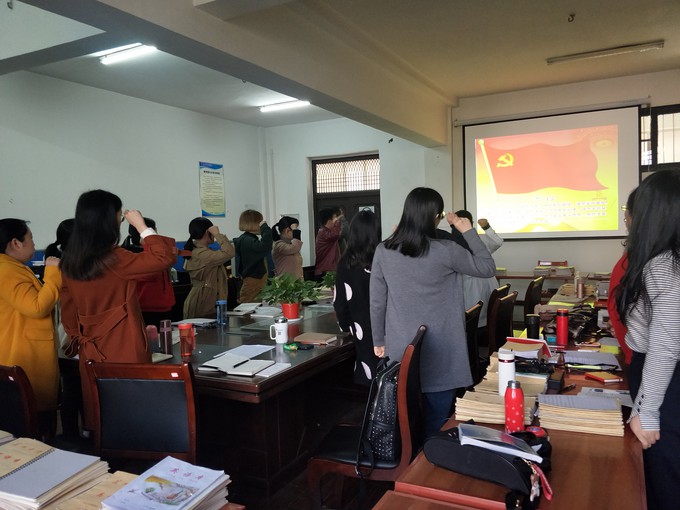 随后教工党支部书记杨杨带领全体党员开展支部主题党日活动。全体党员重温入党誓词,学习习近平总书记在“公司思想政治理论课教师座谈会”上的重要讲话精神、《中共中央关于加强党在政治建设的意见》、《中国共产党重大事项请示报告条例》、教育部党组印发的《关于加强和改进高校领导干部深入基层联系员工工作的通知》、中央和省委关于防治形式主义和官僚主义的相关文件和省委书记蒋超良在全省教育大会上的讲话精神。