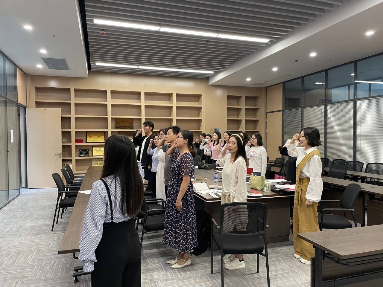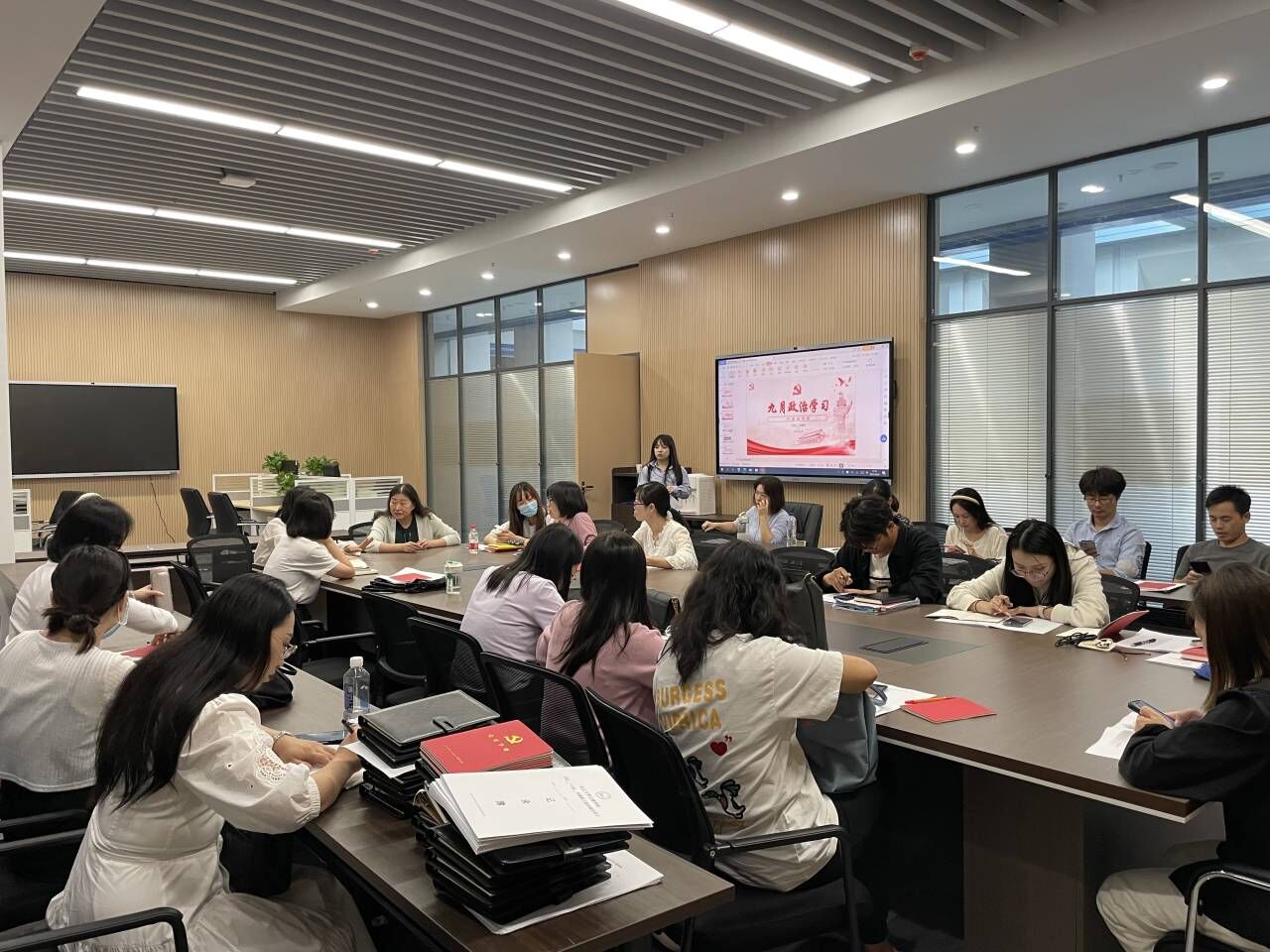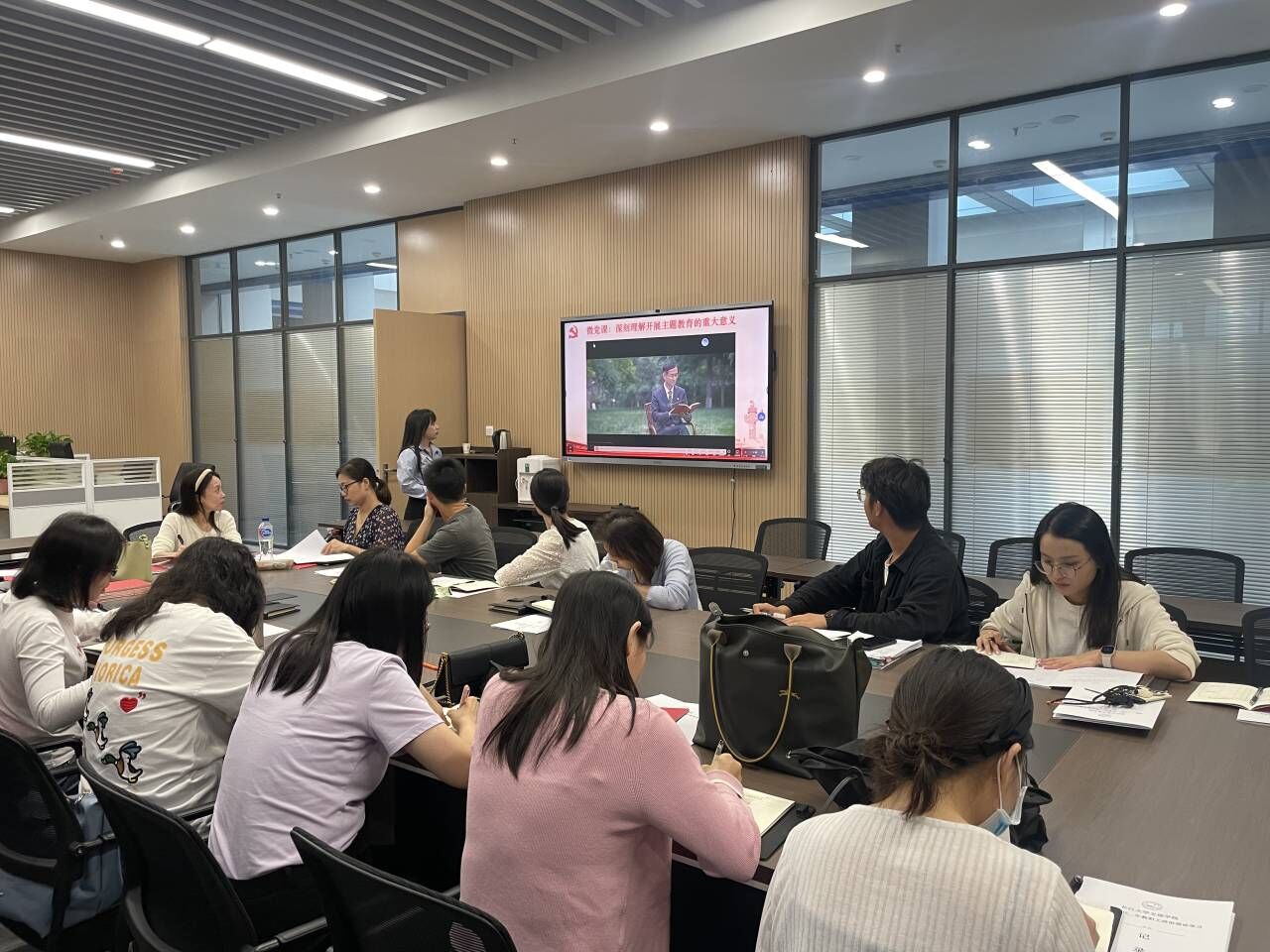 随后,许静婷老师以“深刻理解开展主题教育的重大意义”为主题讲授党课(微党课)。全体党员就作为一名教师党员,谈谈如何通过主题教育学习推动干事创业,进行主题研讨。研讨后集体对员工的译文进行了评阅和更正。