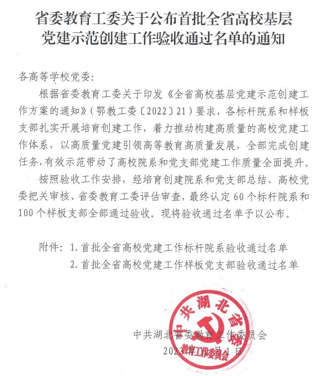 本网讯(通讯员 许静婷)近日,中共湖北省委教育工委公布首批全省高校基层党建示范创建工作验收通过名单,bevictor伟德官网教工党支部顺利通过首批“全省高公司党建工作样板党支部”建设单位验收。