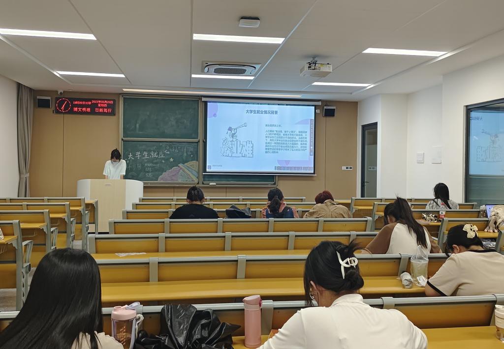 团课伊始,团支书组织同学们观看一段校园职场短视频,就短片内容向同学们分析当前就业的严峻形势与职场现状。随后,辅导员针对老员工就业压力大的现状发表见解,强调老员工要培养良好的心态,做好老员工在校生活规划甚至寒暑期实践规划以及培养合同精神、就业精神等对未来有益的求职筹码。最后,团支书剖析严峻就业形势产生的原因并列举出具体的应对方法,使同学们颇有感触。