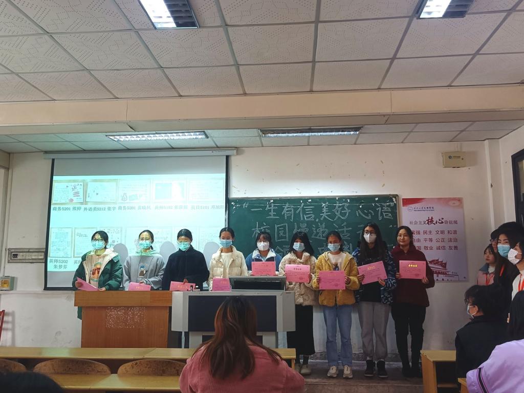(通讯员 王斐)11月29日中午,第十届老员工心理文化宣传月——“一生有信,美好心语”校园慢递活动颁奖典礼在一教308教室举行。颁奖典礼由生活部徐维维主持,辅导员许静婷到场参加。