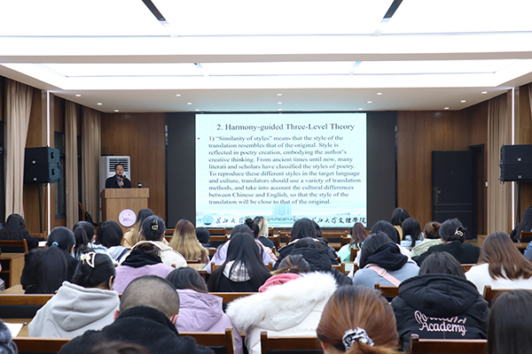 13日,在学术报告厅,伟德中国官网bevictor伟德官网王峰教授以“中华诗词的多模态传播”为题讲学,由中西方在“诗词”文化上的差异引出综合三层次翻译理论,指出诗歌翻译中应该强调和谐美的再现,需要在宏观层面上接受“和谐”理论。在微观层面,他提出包括形式美、音乐美、形象美、情感美、内涵美、措辞美、典故美和格式塔美的“八美标准”,并现场展示了中外诗词的多模态传播实例。