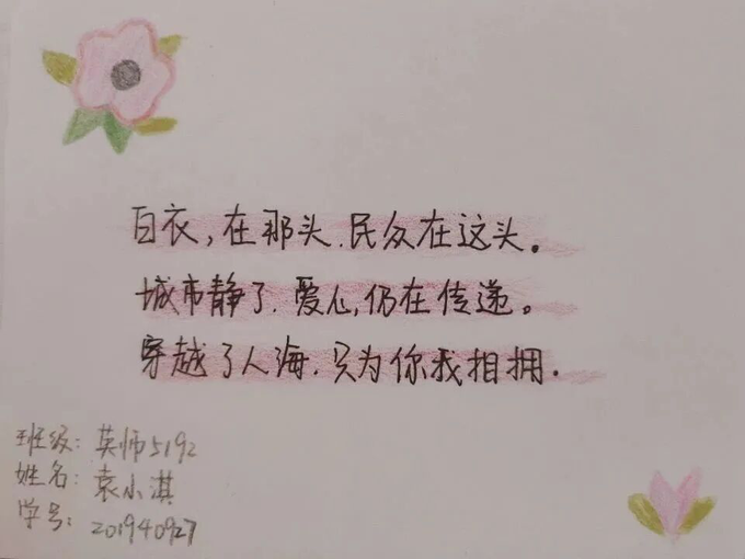 从活动前期宣传到活动的结束都得到众多同学们的积极响应。即使无法像抗疫医护人员一样奔赴在这个没有硝烟的战场前线,但我们的心永远紧跟在这些“最美逆行者”的身后。我们无法付出行动,但我们依旧可以用言语表达我们的敬仰。
