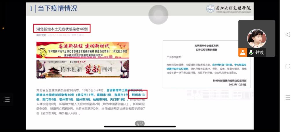 班会伊始,辅导员带领全体同学学习荆州市和公司防控指挥部相关要求。接着,就员工工作部《关于做好当前疫情防控工作的紧急通知》进行详细解释说明,介绍了一查二报三管四停五服六处的具体要求。