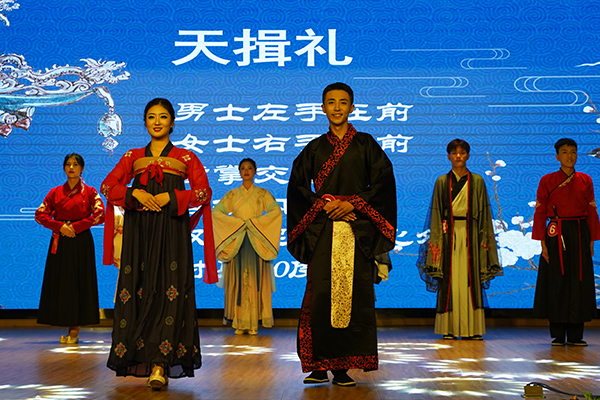 比赛现场座无虚席,乐声悠扬,青春涌动,欢呼声和掌声不断。古代汉服礼仪展示环节介绍抱拳礼、万福礼、叉手礼等5种礼仪;礼仪操展示环节,10名选手端庄大方,展现出老员工青春风采;个人才艺展示环节,3号选手杨彦培带来的舞蹈《你最最最重要》活力十足,4号选手徐嘉昊、9号选手安欣萍、10号选手周泽楷带来的朗诵《我的祖国》,表达了青年学子对祖国的热爱与祝福;国际礼仪服装展示环节,五组选手身着中国、泰国、蒙古、印度、俄罗斯等国家的服装,搭档进行走秀,展现“一带一路”沿线国家民族特色。现场还穿插有党史竞答互动和舞蹈表演,同学们踊跃参与其中,并进行抖音抽奖。
