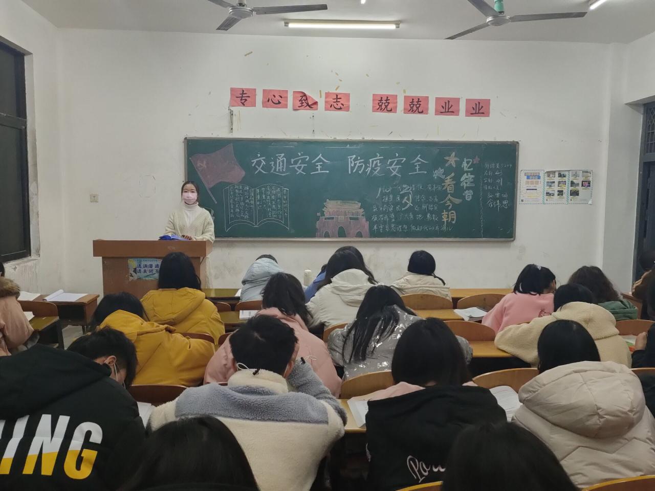 班委通过讲述近期交通事故实例向同学们普及安全教育知识,并提醒同学们遵守交通规则,强化安全意识,提高防范能力,保护自身安全;接着强调,现今仍处于疫情防控的重要阶段,防控形势依然严峻,同学们出门须戴好口罩,勤洗手,多通风,少去人员密集的场所。