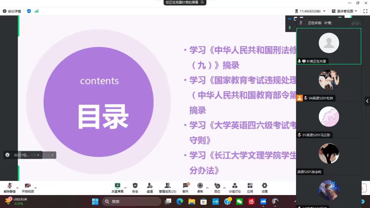 班会上,班主任组织同学们学习《中华人民共和国刑法修正案(九)》摘录、《国家教育考试违规处理办法》(中华人民共和国教育部令第33号)摘录、《大学英语四六级考试考生应试守则》、《bevictor伟德官网员工违纪处分办法》等相关考风考纪教育文件。特别强调了考试纪律与学业发展密切相关。班主任指出,同时,也提醒同学们注意考场新规定,提前检查三证齐全和考试用品。