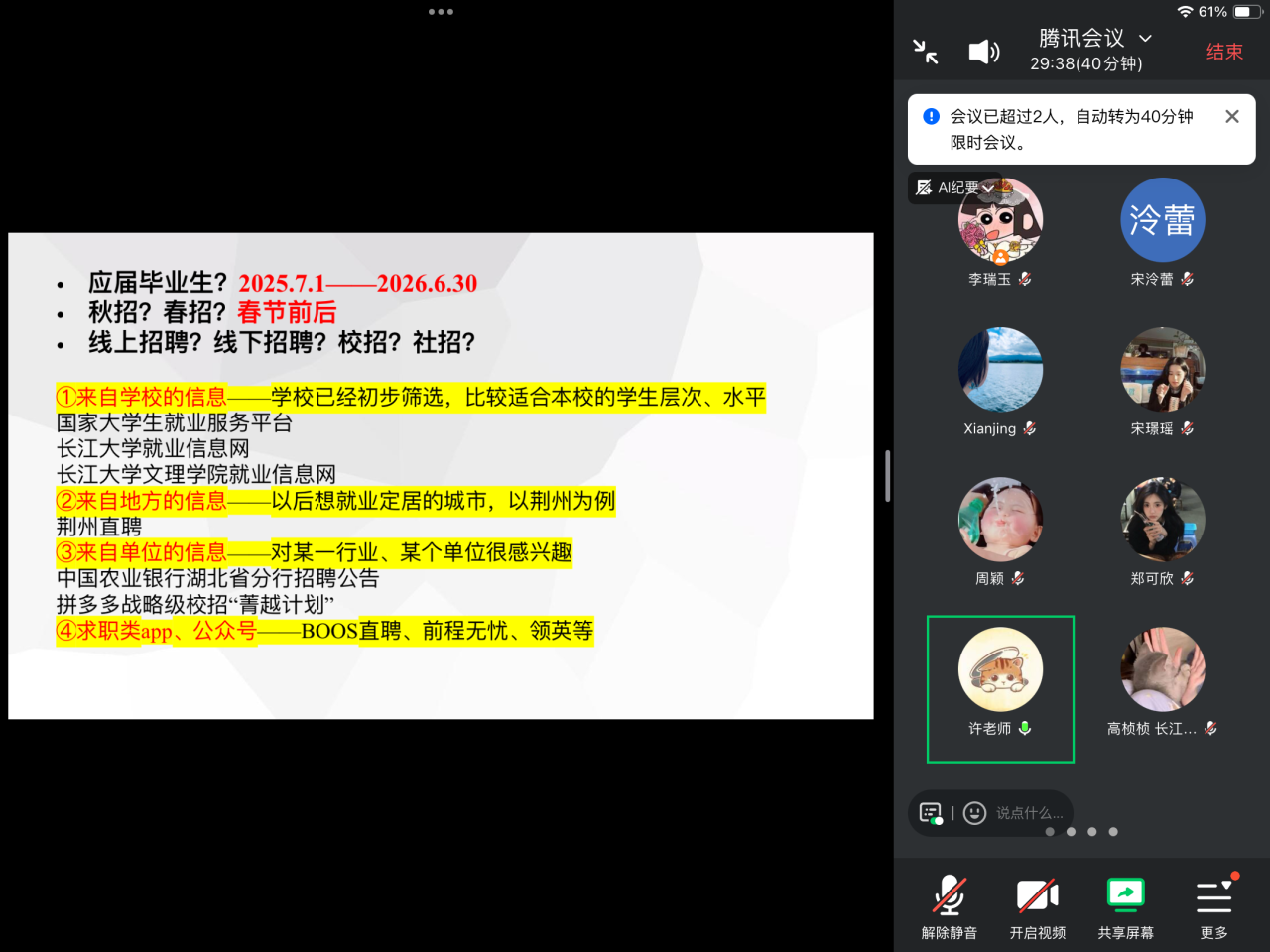 首先,辅导员许静婷详细说明了“2026届毕业生就业日历”,梳理了从职业探索、实习实践到秋招、国考、考研及春招等关键时间节点,帮助同学明确各阶段任务。同时,推荐了公司就业网、正规招聘平台、企业官网等可靠信息渠道,提醒员工注意甄别信息,防范收费诈骗、虚假招聘等陷阱。