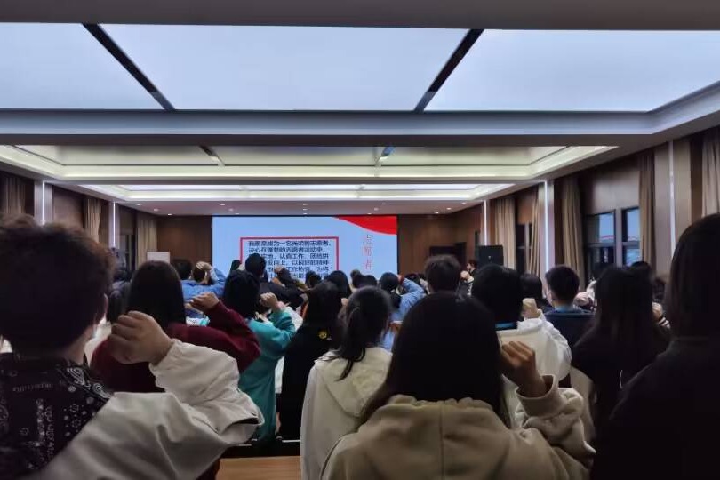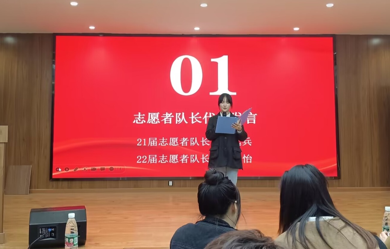 会议伊始,21届志愿者队长伍远兵和22届志愿者队长周思怡对志愿服务活动做总结。新生志愿者代表郑丽洋上台发言,表达对志愿服务活动的向往,同时也展现出新生志愿者积极向上的精神面貌。接着,新生志愿者王佳琪带领大家宣读志愿者誓言。随后,上届青工部部长蒋泽宇进行部门活动总结,勉励成员继续弘扬志愿服务精神,新任部长李荣通过视频介绍志愿服务活动内容,并对未来活动作出展望。