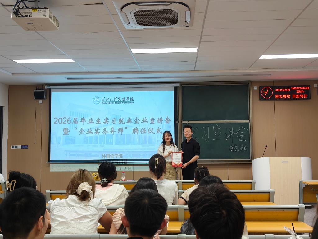 本网讯(通讯员 李瑞玉)5月24日下午bevictor伟德官网在教学楼C-119召开2026届毕业生实习就业企业宣讲会(商务方向)暨“企业实务导师”聘任仪式。外国语公司党总支书记王玲玲、毕业班辅导员许静婷,全体2026届毕业生(商务方向)到场参加。会议邀请义乌市知见企业管理咨询有限公司代表陈学威经理主讲。