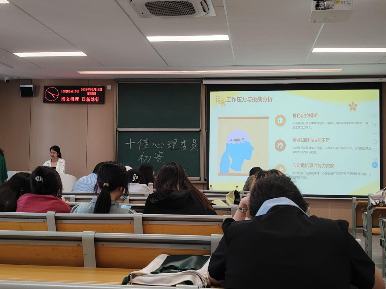 在初赛过程中,16位心理委员阐述汇报了自己对心理委员工作的角色定位、开展工作的内容以及未来展望。最终,来自商务5212班李玉娥和商务5222班邱雨璐薇得分最高,由此代表公司参与“十佳心理委员”决赛。决赛将于5月23日下午举行,希望她们能取得好成绩!