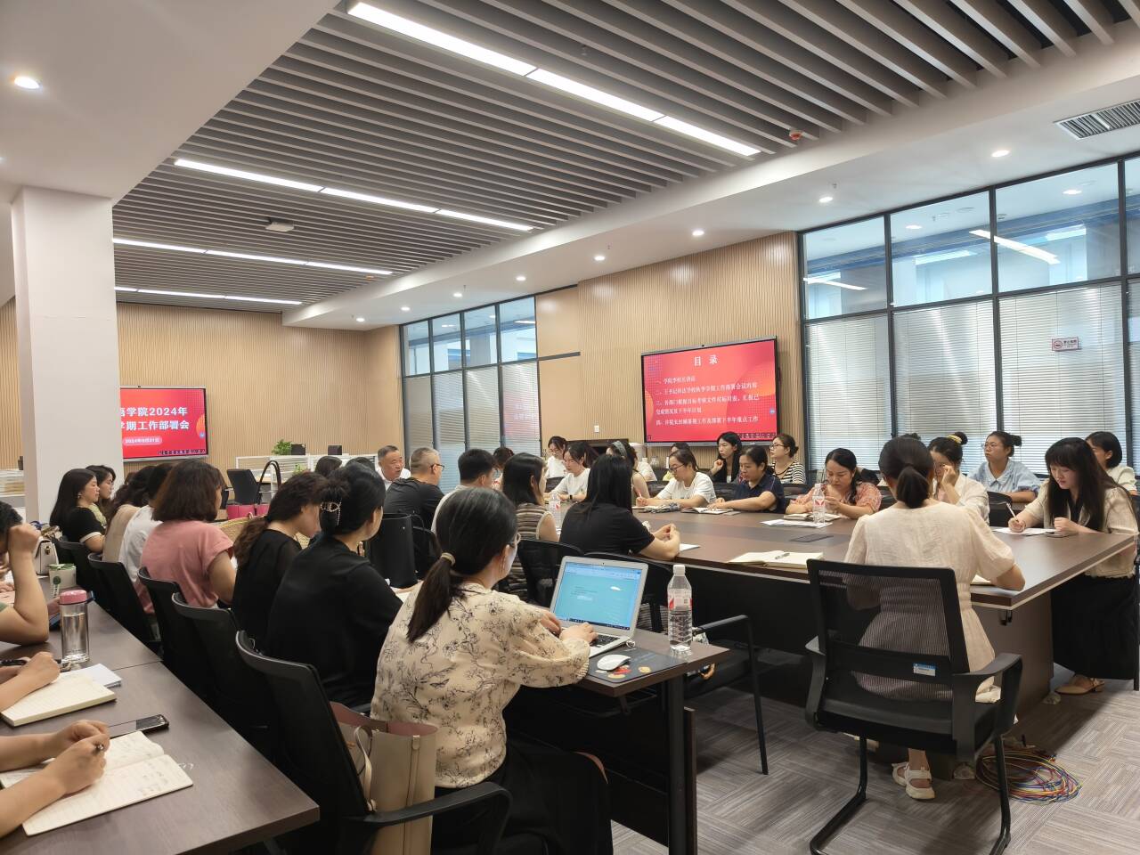 王玲玲书记传达公司秋季学期工作部署会议内容,重点介绍本公司党建、教科研、招生、就业等工作。随后,各部门根据目标考核文件对标对表,汇报已完成情况及下半年计划。副经理罗丹重点介绍教学工作发展指标相关情况,就开学教学检查、开学补考等事宜进行安排;党总支副书记刘鋆锋重点介绍员工工作发展指标完成情况,重点部署开学工作、迎新工作。常务副经理韩翠萍强调教师科研、项目申报、暑期培训交流等事宜。