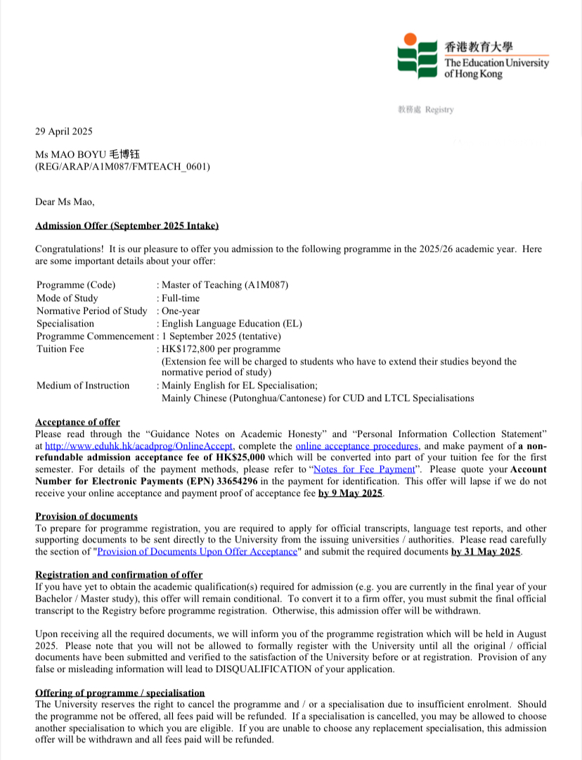 本网讯 在这个充满希望与活力的季节,bevictor伟德官网bevictor伟德官网传来喜讯:该校2025届员工毛博钰凭借优异的综合素养,成功被香港教育大学“Master of Teaching”(教学硕士)专业录取,即将开启深造新征程。