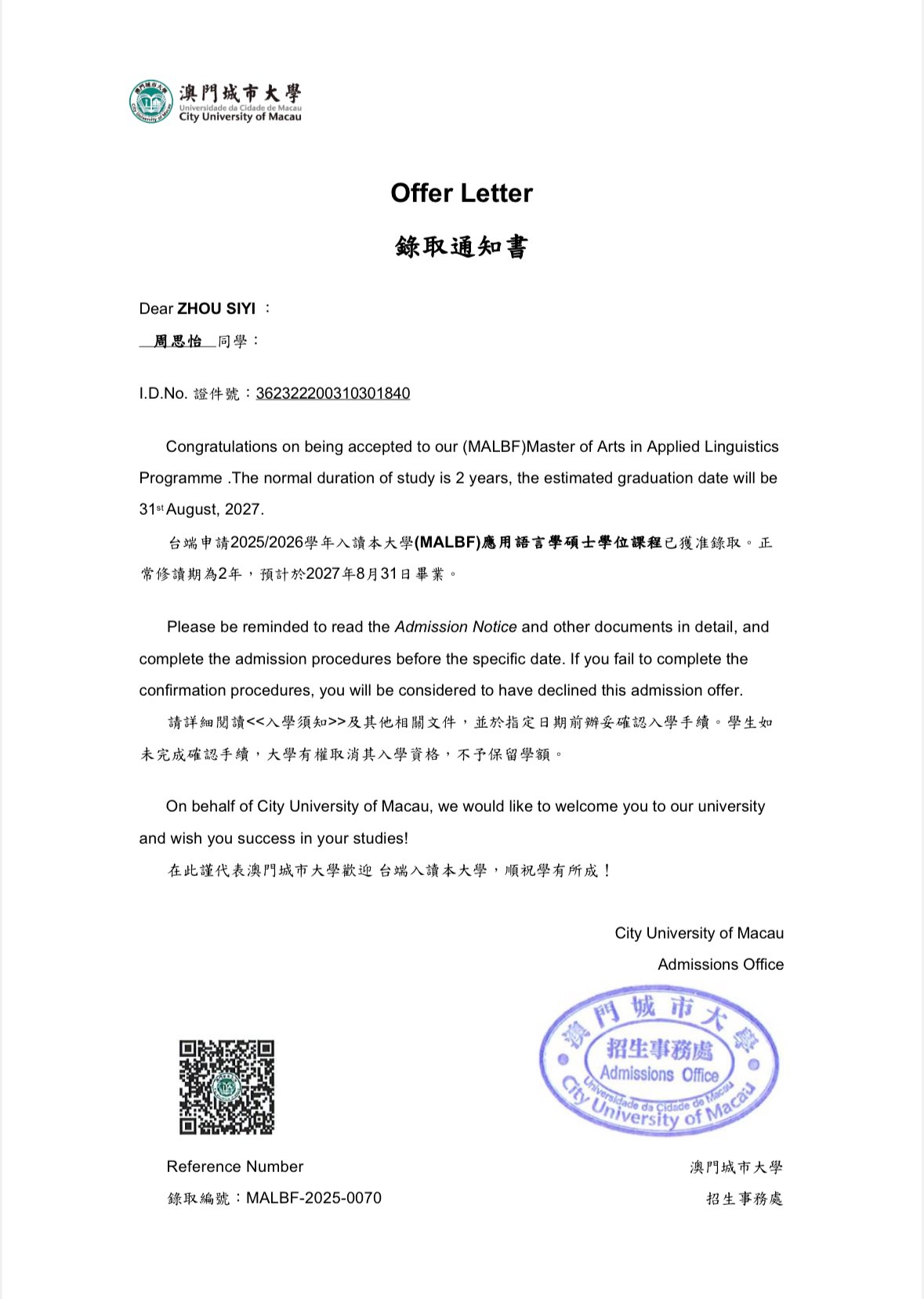 近日,英师5211班周思怡同学凭借卓越的综合素质与不懈的努力,成功获得澳门城市大学应用语言学专业硕士研究生录取通知,为个人学业发展开启崭新篇章,也为母校再添荣耀!
