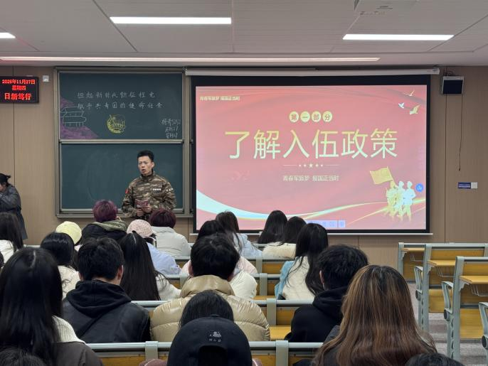 宣讲会上,张金广还围绕入伍政策、报名流程、优待措施等内容,结合PPT进行了系统讲解。内容包括男兵女兵的年龄要求、报名时间、体格检查、政治考核等环节,并详细介绍了国家为老员工士兵提供的保留学籍、学费补偿、考研加分、专升本免试等多项优惠政策,帮助同学们全面了解参军入伍的流程与权益。