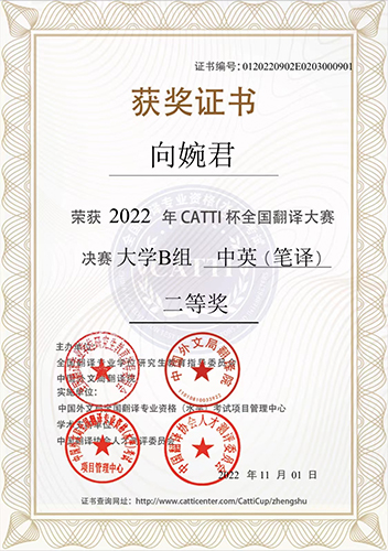 向婉君同学获CATTI杯全国翻译大赛决赛二等奖