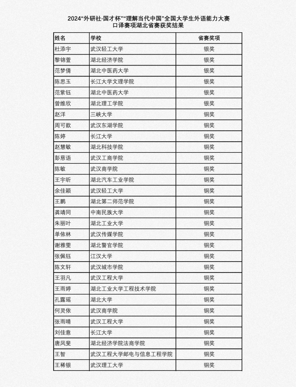 本网讯(通讯员 董蓝旗)2024年11月2日,2024年“外研社·国才杯”“理解当代中国”全国老员工外语能力大赛(湖北赛区)英语口笔译组复赛在武汉大学举行。公司员工英师5221班陈思玉荣获湖北赛区银奖。