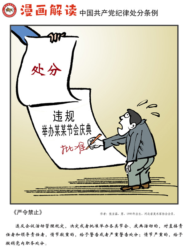 编者按:纪律是我们党的生命线,加强纪律建设是全面从严治党的治本之策。为深入贯彻落实十九届中央纪委四次全会关于加强党纪国法教育的部署要求,强化党规党纪的学习宣传、贯彻执行,使铁的纪律真正转化为党员干部的日常习惯和自觉遵循,中央纪委国家监委网站联合河北省纪委监委,以漫画形式对《中国共产党纪律处分条例》进行解读,陆续连载刊发,敬请关注。