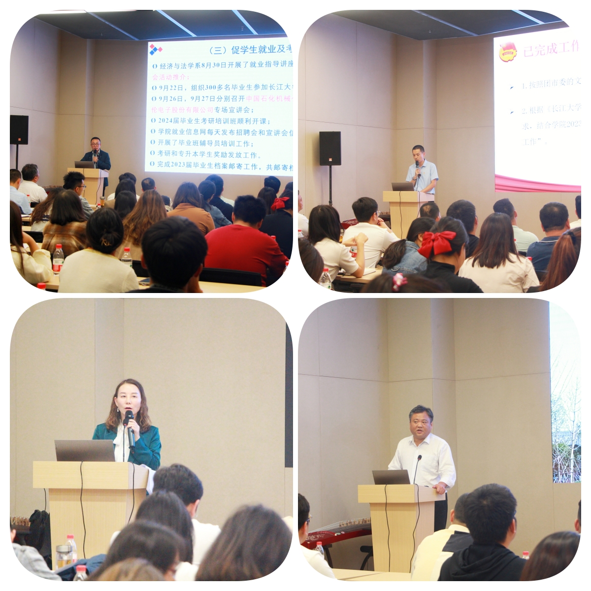刘美林从毕业生数据报送、员工竞赛、促员工就业及考研培训三个方面汇报了员工就业指导处9月份的工作,并对10月份工作进行安排。陈海波将9月份团委已开展工作用数据和图表进行详细的展示,并对接下来的常规工作和重点工作进行了明确部署。李刚英从九个方面汇报了员工工作部9月份已开展的工作,并部署了近期七个方面的工作安排。