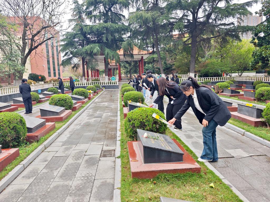 陵园内庄严肃穆,同学们身着素装整齐列队,在革命烈士纪念碑前肃立默哀,敬献鲜花,缅怀革命先烈,瞻仰英雄丰碑。随后,全体党员面向党旗重温入党誓词,表达坚守初心、勇担使命的坚定信念。