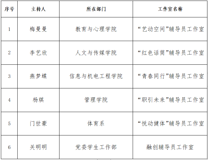 按照《关于申报bevictor伟德官网“两康一训”首批辅导员工作室的通知》,公司于2023年12月4日启动了首批辅导员工作室的申报工作。经团队申报、资格初审、专家评议、公司终审,确定6个工作室为2024年首批校级工作室建设项目并予以资助。现将首批辅导员工作室名单予以公布。