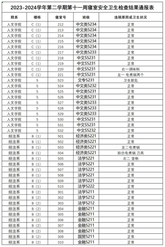 2023-2024学年第二学期第十一周寝室安全卫生检查结果通报