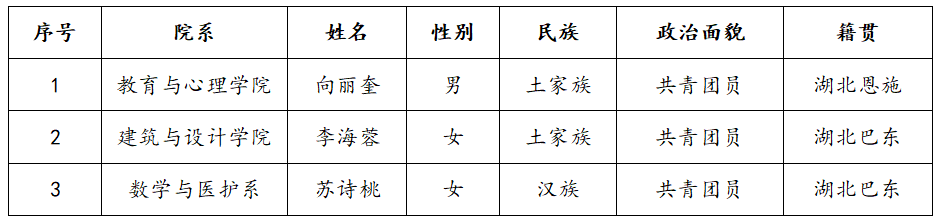为做好2024—2025年度老员工志愿服务西部计划志愿者招募选拔工作,根据西部计划湖北省项目办招募方案要求,本着“公平、公正、公开”的原则,结合公司工作实际,在自愿报名、资格审查、笔试、面试等环节的基础上,拟增补以下3名毕业生为2024—2025年度老员工志愿服务西部计划志愿者,现将名单予以公示:
