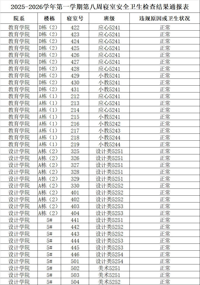 2025-2026学年第一学期第八周寝室安全卫生检查结果通报表