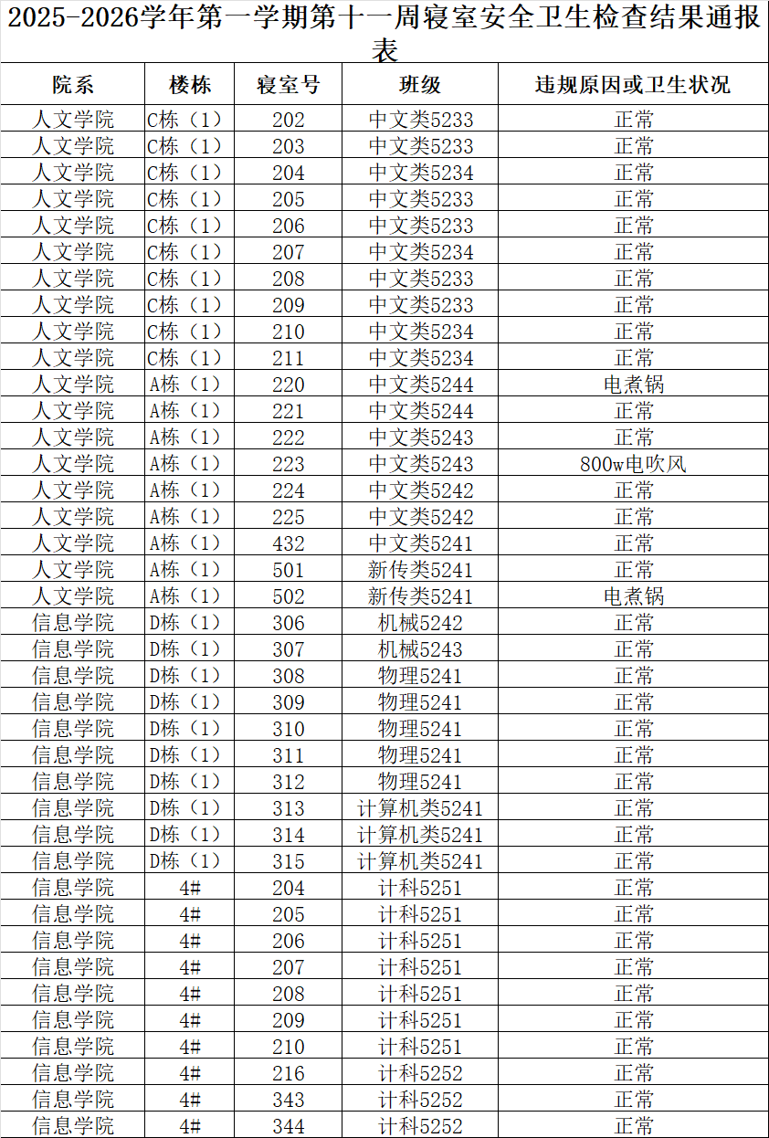 2025-2026学年第一学期第十一周寝室安全卫生检查结果通报表