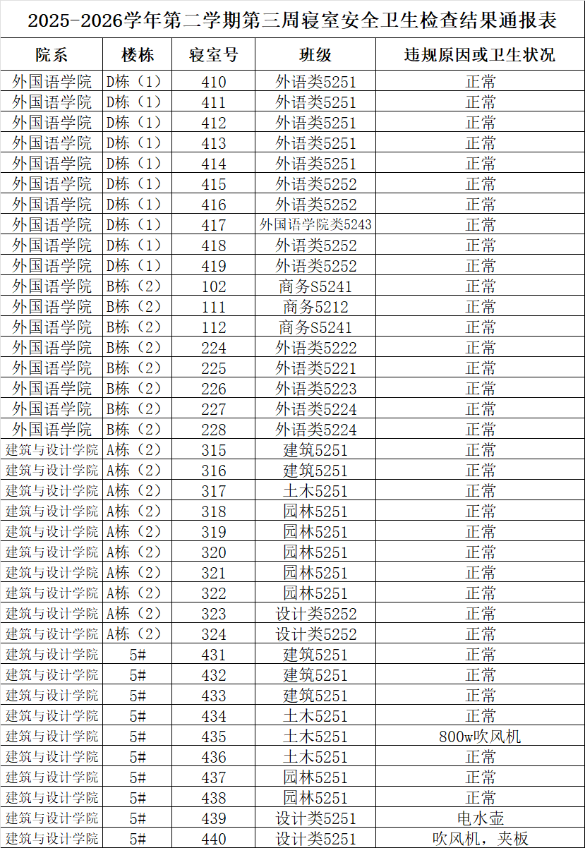2025-2026学年第二学期第三周寝室安全卫生检查结果通报表