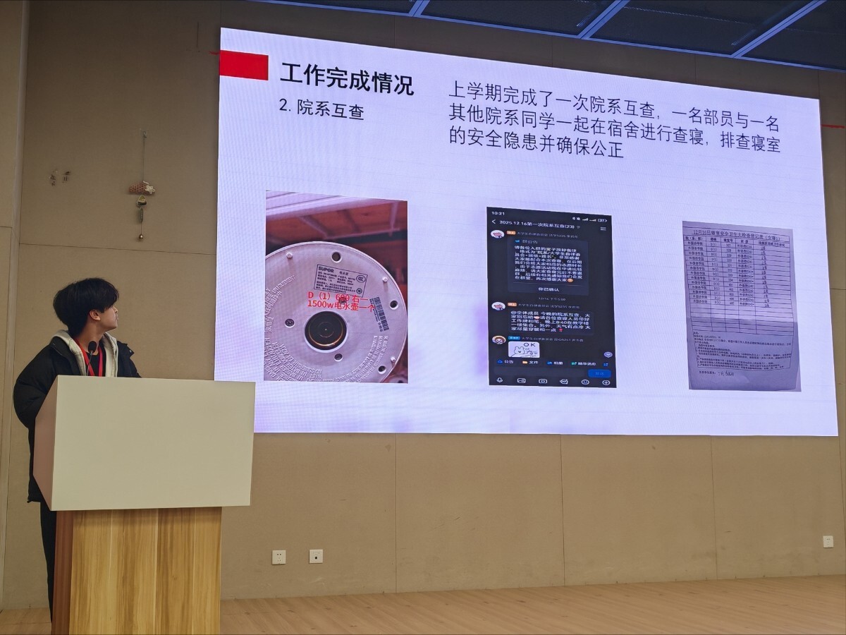 大会伊始,各部门代表依次上台作工作汇报,结合上学期工作谈成效、找问题,围绕新学期工作定目标、谋举措。综合办公室复盘假条制作、考勤统筹、内部纪检等工作,提出优化细节、提升应变能力的举措;学习监察部围绕早晚自习、课堂及早操考勤,制定细化流程、加强人员协作的新计划;宿舍监察部梳理查寝、晚归排查等工作,针对自身问题制定改进方法,强调筑牢宿舍安全防线;校园服务部立足服务师生的核心宗旨,规划考勤配合、校园保障、特色活动开展等工作;宣传部以“逐光向新,实干争先”为目标,汇报全渠道宣传矩阵搭建、月度主题宣传等新学期规划。