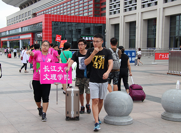 在荆州火车站,公司安排了20余名志愿者在出站口迎接新生。他们在中午1点左右到达火车站开始工作,直至下午6点才返回公司。